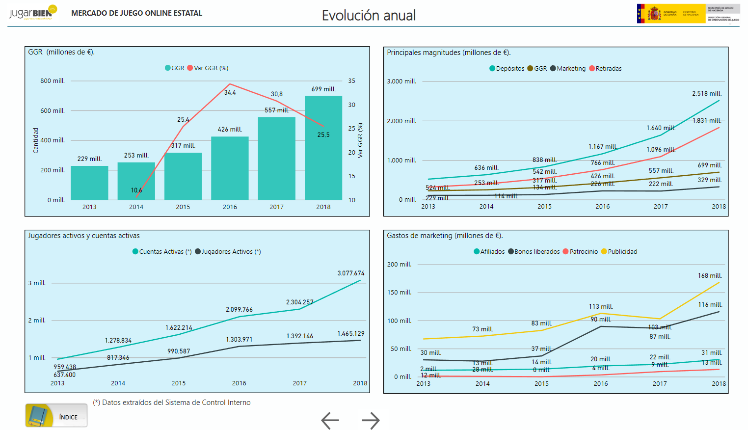 Se publica el informe anual de mercado de juego online estatal de 2018. Este informe, compendio de los informes trimestrales de juego online publicados por la DGOJ, se realiza como paso previo a la publicación de los Datos del Mercado Español de juego.