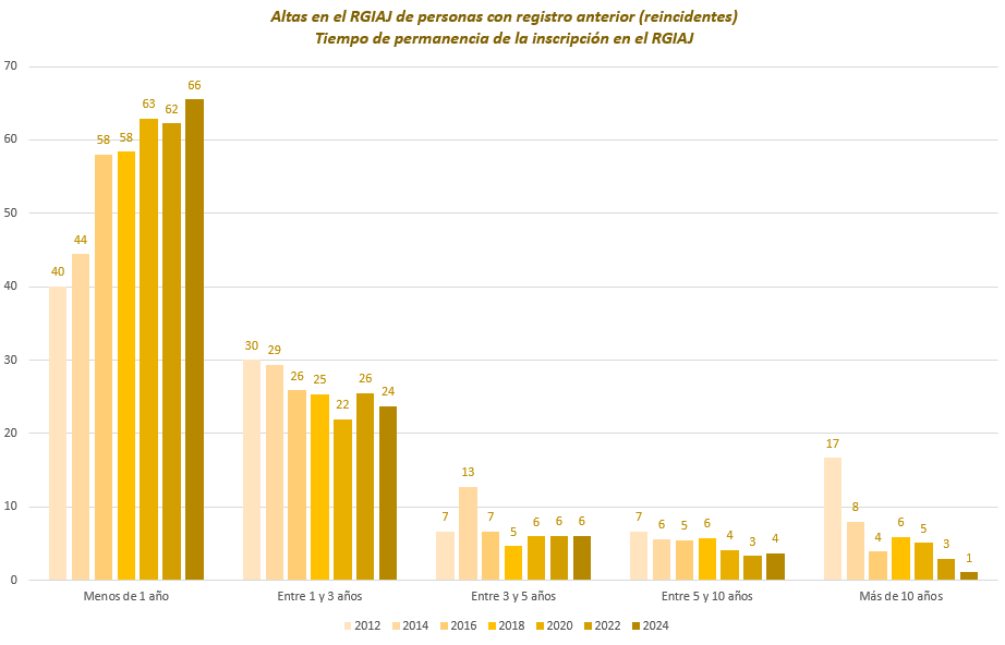 Los datos más relevantes sobre aquellos que vuelven a inscribirse en el RGIAJ, y en concreto el tiempo en que la anterior inscripción estuvo vigente previo a la nueva solicitud, así como el tiempo que trascurrió entre la solicitud de baja y la nueva solicitud de inscripción, son los siguientes: