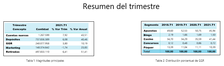 Del resto de las principales magnitudes, depósitos y retiradas de los jugadores, aumentan sus tasas de variación respecto del trimestre anterior un 6,08% y 6,41% respectivamente. El gasto en marketing experimenta un descenso del -1,74% respecto del trimestre anterior y las cuentas nuevas aumentan respecto al trimestre anterior un 7,92%. Las variaciones respecto al mismo trimestre del año anterior son de aumento en todos los conceptos y se recogen en la Tabla 1.