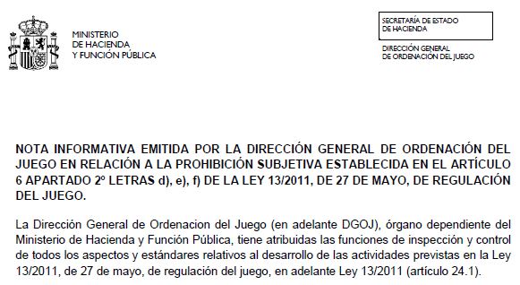 La DGOJ considerando conveniente promover, de manera proactiva, un alto nivel de integridad y un bajo riesgo de fraude en el mercado regulado de apuestas deportivas de ámbito estatal y, con ello, reforzar su reputación como entorno seguro y carente de posibles ventajas competitivas ilegítimas por parte de determinados jugadores, publicó en fecha 4 de julio de 2017 una nota informativa dirigida a los potenciales afectados por la mencionada prohibición.