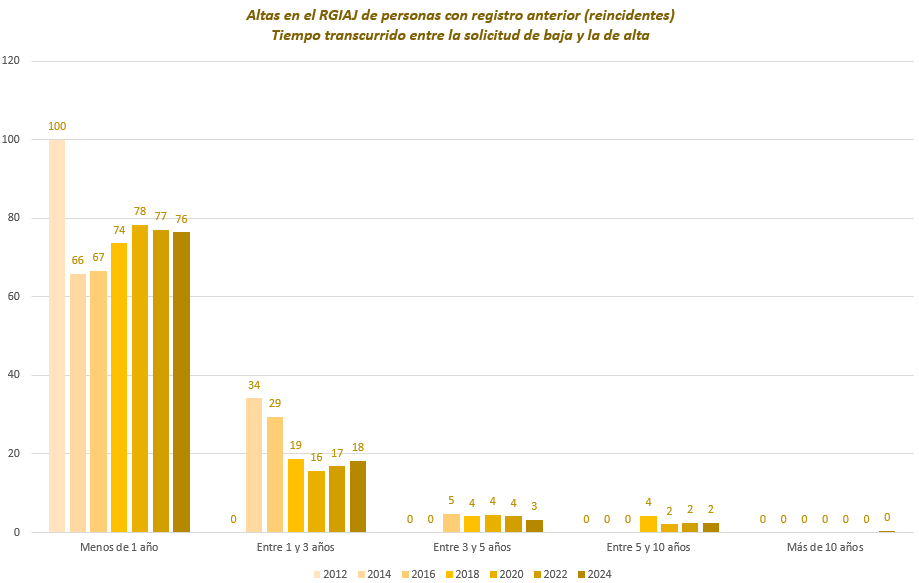 Los datos más relevantes sobre aquellos que vuelven a inscribirse en el RGIAJ, y en concreto el tiempo en que la anterior inscripción estuvo vigente previo a la nueva solicitud, así como el tiempo que trascurrió entre la solicitud de baja y la nueva solicitud de inscripción, son los siguientes: